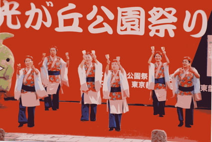 また、浅草千束通り夏祭り、調布よさこい祭り、ふくろ祭り(池袋)お台場ドリームよさこいなど12か所に出演した。地域内では陸上自衛隊の夏祭り、各地の祭りや行事、老人施設の慰問など積極的に地域と関わり合って、よさこいの普及に努力している。その結果、幼稚園や小中学校の運動会などの主要種目に導入されるようになった。 私達のチームは年輩者が多いので――光が丘に子供のチームが一昨年、できたが――今年(2004年)は若い人たちのチームをつくろう、とその主力となる仲間を探しています。練習場の確保、PRについては、よさこい鳴子光丘連合や地域のタウン紙・光が丘新聞社がお世話しますので、ご連絡を待っています。 |